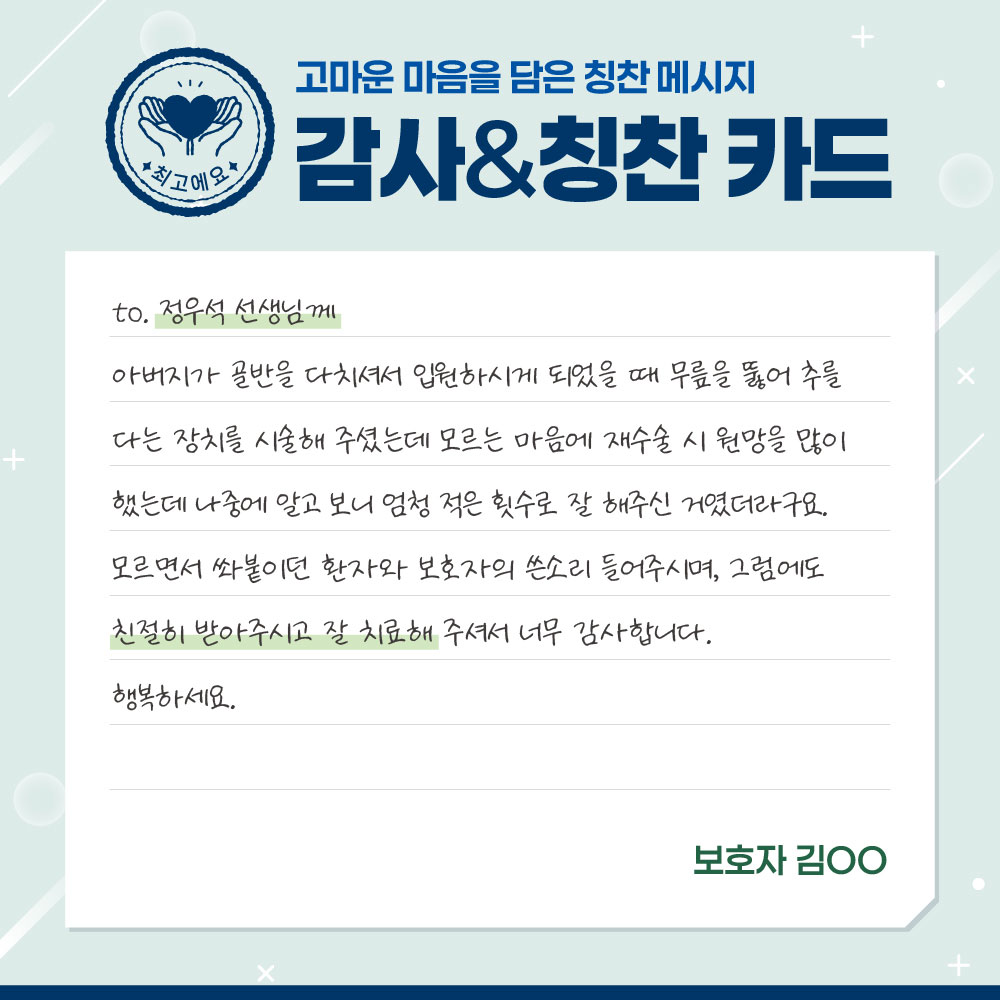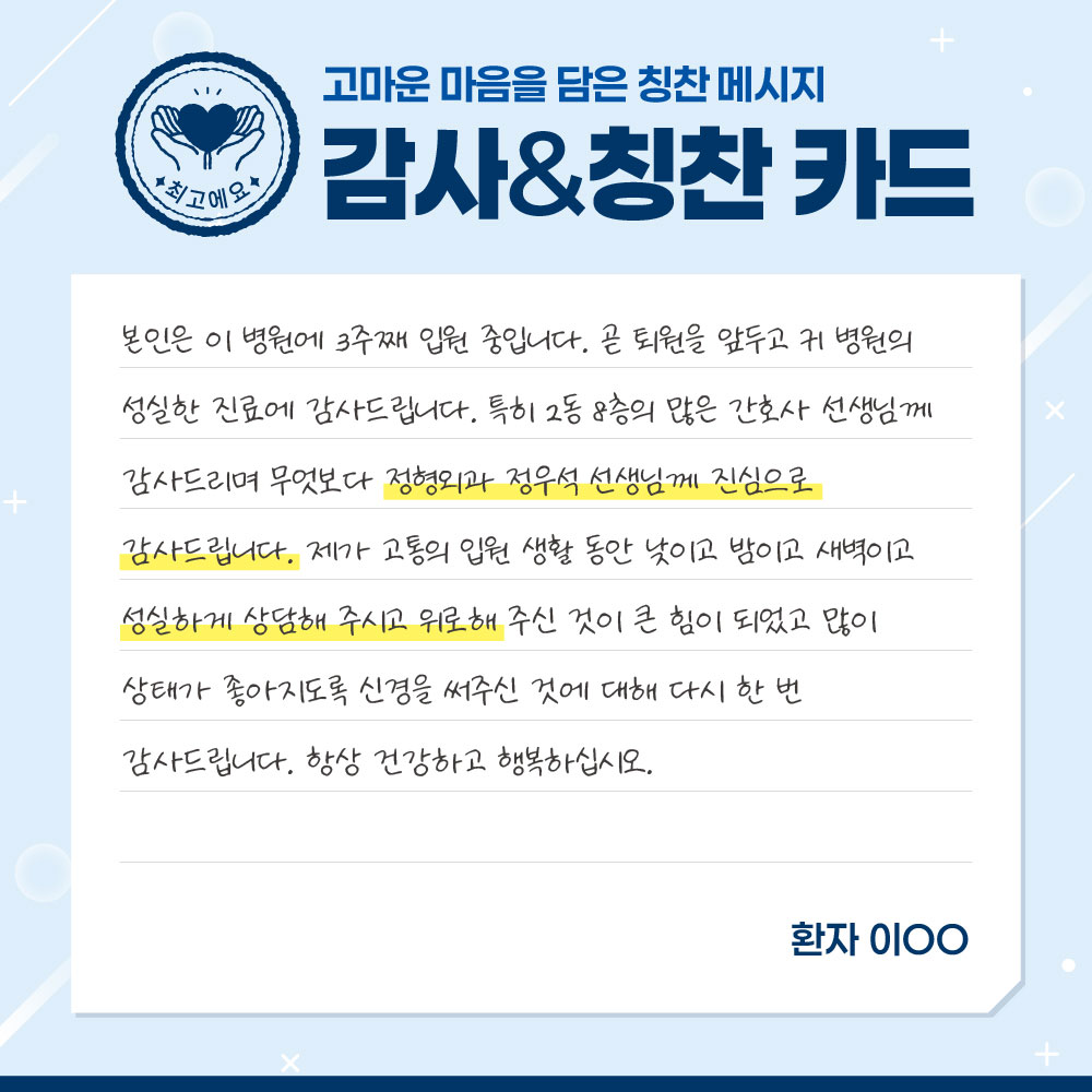 앞으로도 환자분들의 목소리에 귀 기울이며 더 나은 진료와 편안한 치료 환경을 위해 노력하겠습니다.