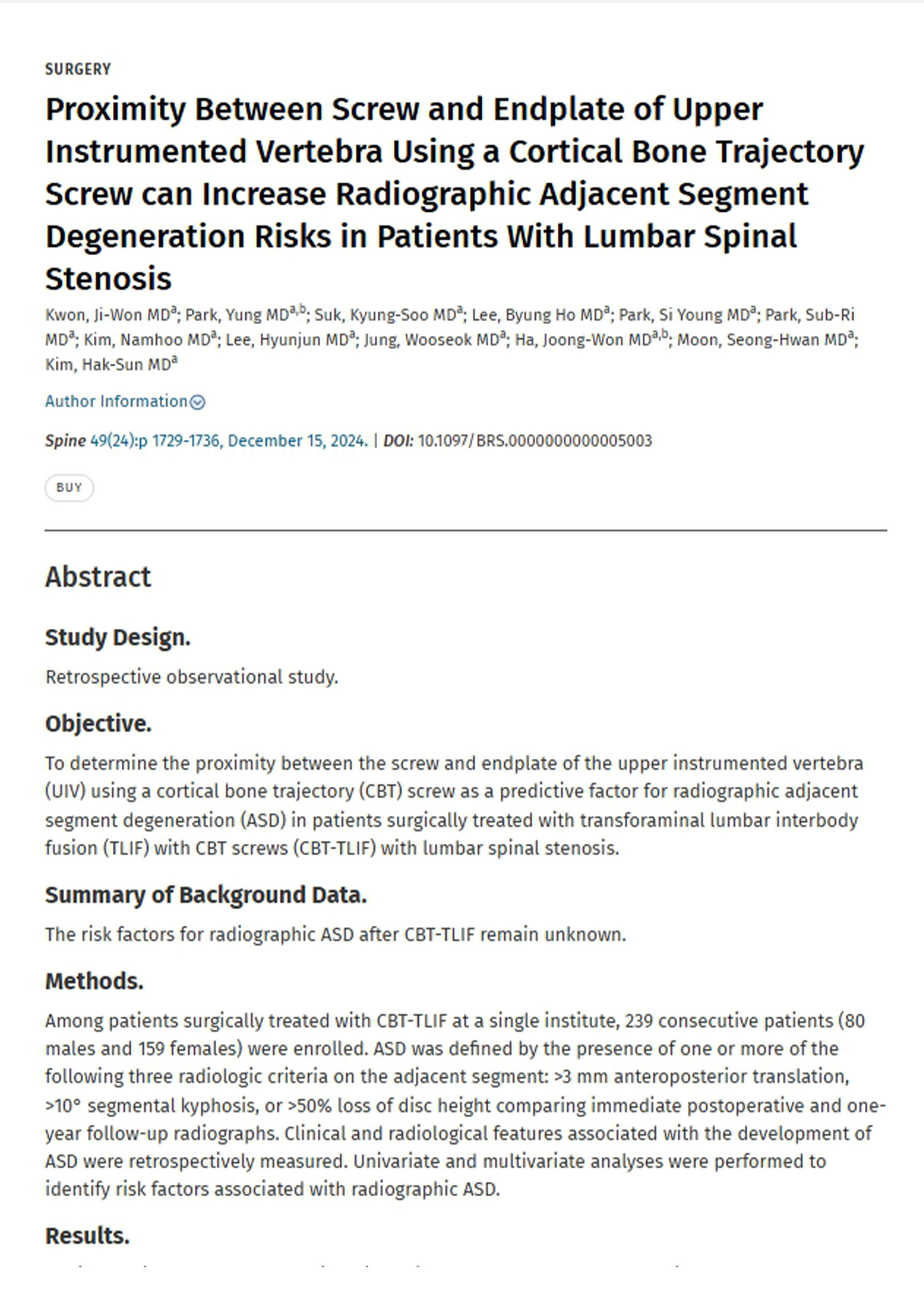 Proximity Between Screw and Endplate of Upper Instrumented Vertebra Using a Cortical Bone Trajectory Screw can Increase Radiographic Adjacent Segment Degeneration Risks in … JWMD Kwon, B Park, Yung MD, KSMD Suk, BHMD Lee, SYMD Park, ... Spine