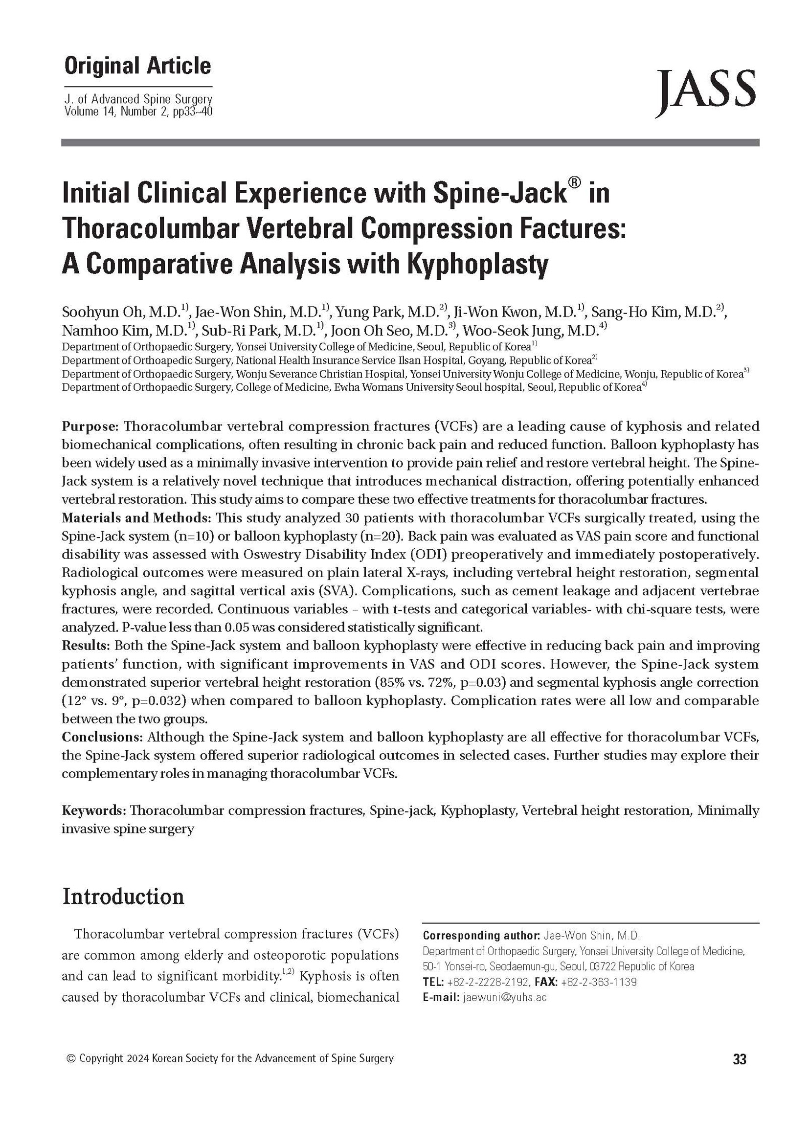 Initial Clinical Experience with Spine-Jack® in Thoracolumbar Vertebral Compression Fractures: A Comparative Analysis with Kyphoplasty S Oh, JW Shin, Y Park, JW Kwon, SH Kim, N Kim, SR Park, JO Seo, ... JASS