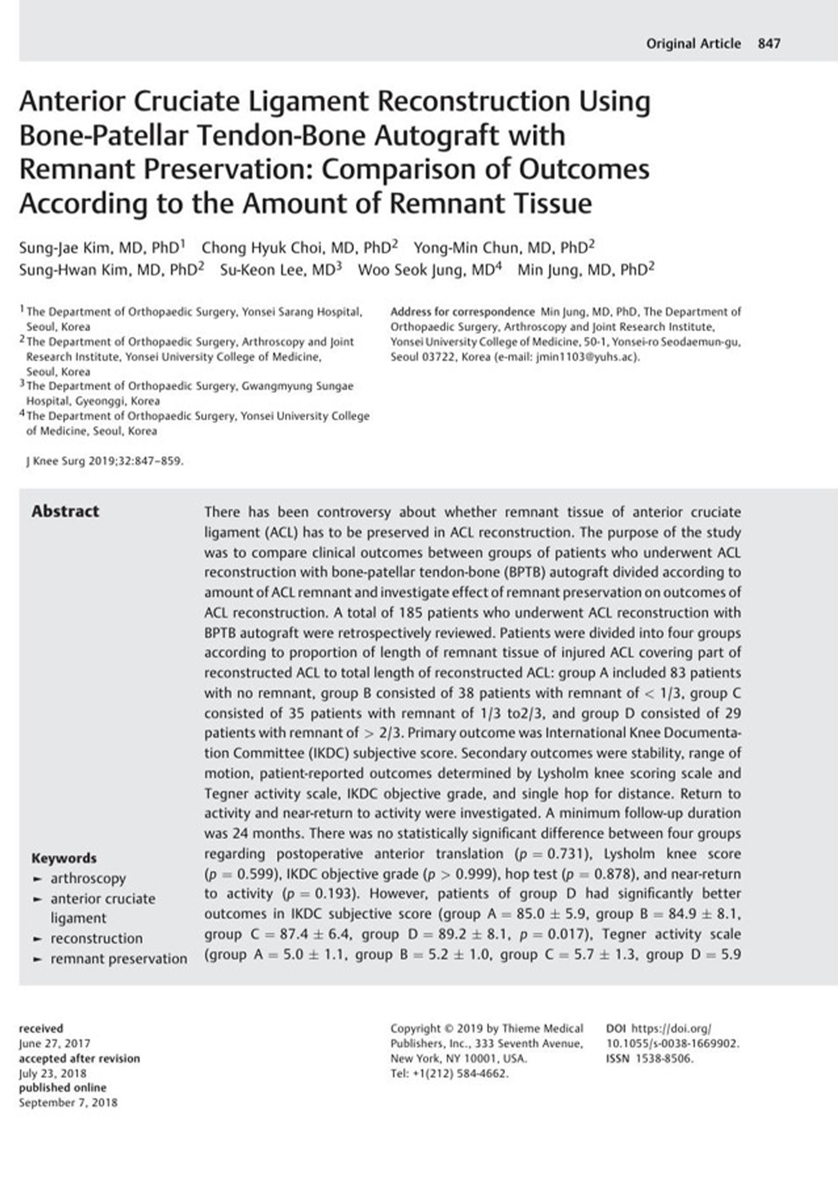 Anterior cruciate ligament reconstruction using bone-patellar tendon-bone autograft with remnant preservation: comparison of outcomes according to the amount of remnant tissue SJ Kim, CH Choi, YM Chun, SH Kim, SK Lee, WS Jung, M Jung The Journal of Knee Surgery 32 (09), 847-859