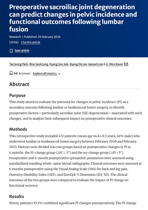 Preoperative sacroiliac joint degeneration can predict changes in pelvic incidence and functional outcomes following lumbar fusion European Spine Journal (2026) TJ Park, WS Jung, KS Suk, BH Lee, JN Lee & JW Kwon
